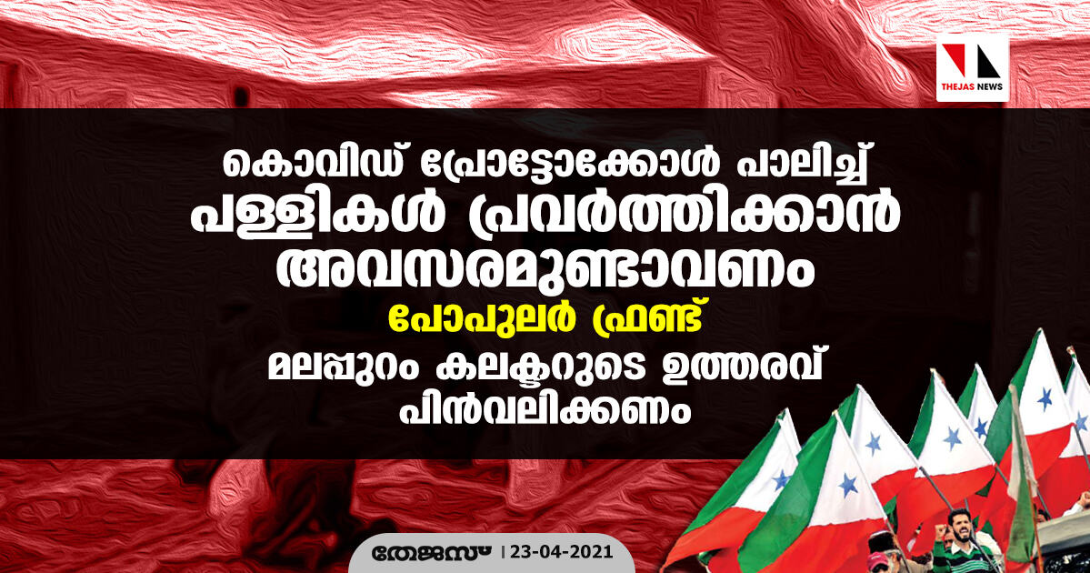 കൊവിഡ് പ്രോട്ടോക്കോള് പാലിച്ച് പള്ളികള് പ്രവര്ത്തിക്കാന് അവസരമുണ്ടാവണം: പോപുലര് ഫ്രണ്ട്