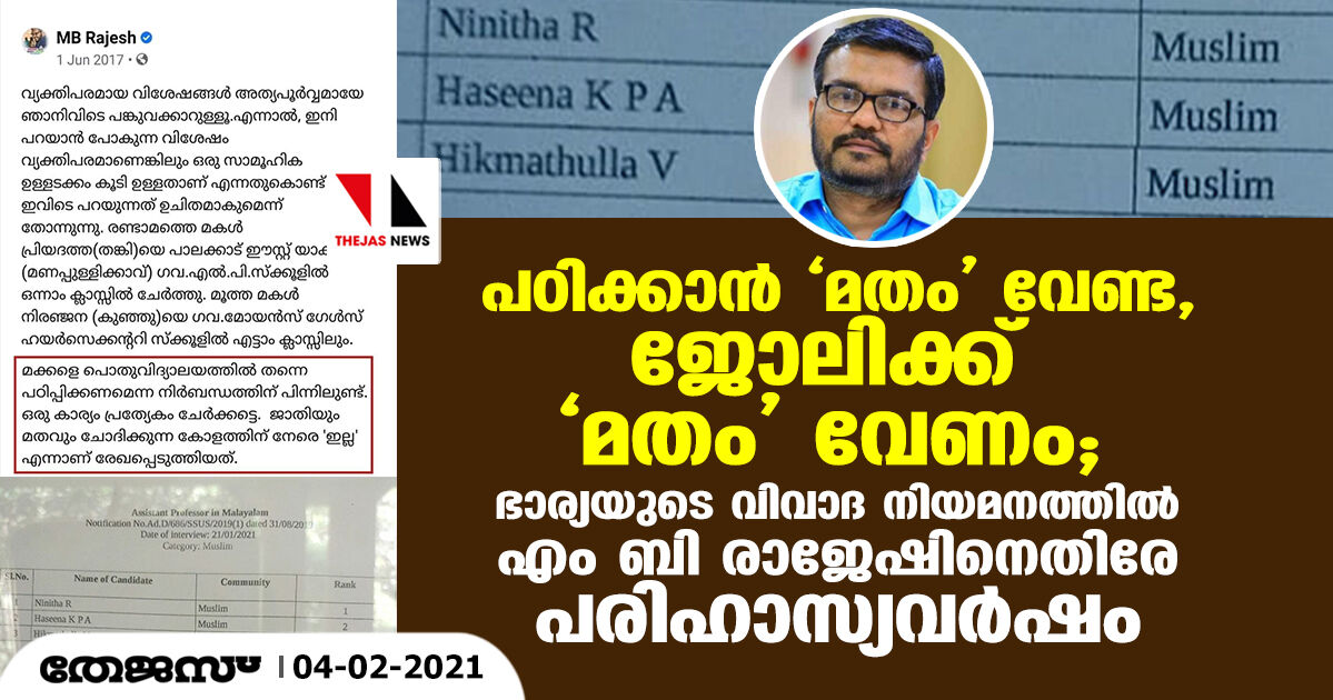 പഠിക്കാന് 'മതം' വേണ്ട, ജോലിക്ക് 'മതം' വേണം; ഭാര്യയുടെ വിവാദ നിയമനത്തില് എം ബി രാജേഷിനെതിരേ പരിഹാസ്യവര്ഷം