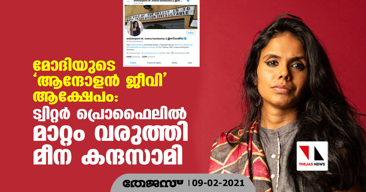 മോദിയുടെ 'ആന്ദോളന് ജീവി' ആക്ഷേപം: ട്വിറ്റര് പ്രൊഫൈലില് മാറ്റം വരുത്തി മീന കന്ദസാമി