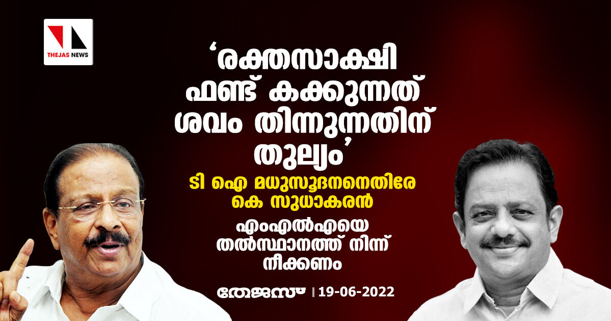 രക്തസാക്ഷി ഫണ്ട് കക്കുന്നത് ശവം തിന്നുന്നതിനു തുല്യമാണെന്നും, മധുസൂദനൻ എംഎൽഎ എന്ന നിലയിൽ തുടരരുതെന്നും കെ സുധാകരൻ ആവശ്യപ്പെട്ടു.