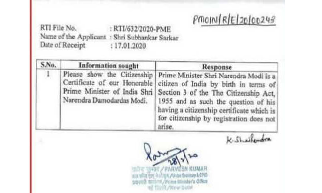 നരേന്ദ്ര മോദിക്ക് പൗരത്വ സര്ട്ടിഫിക്കറ്റില്ല: പ്രധാനമന്ത്രിയുടെ ഓഫിസ്
