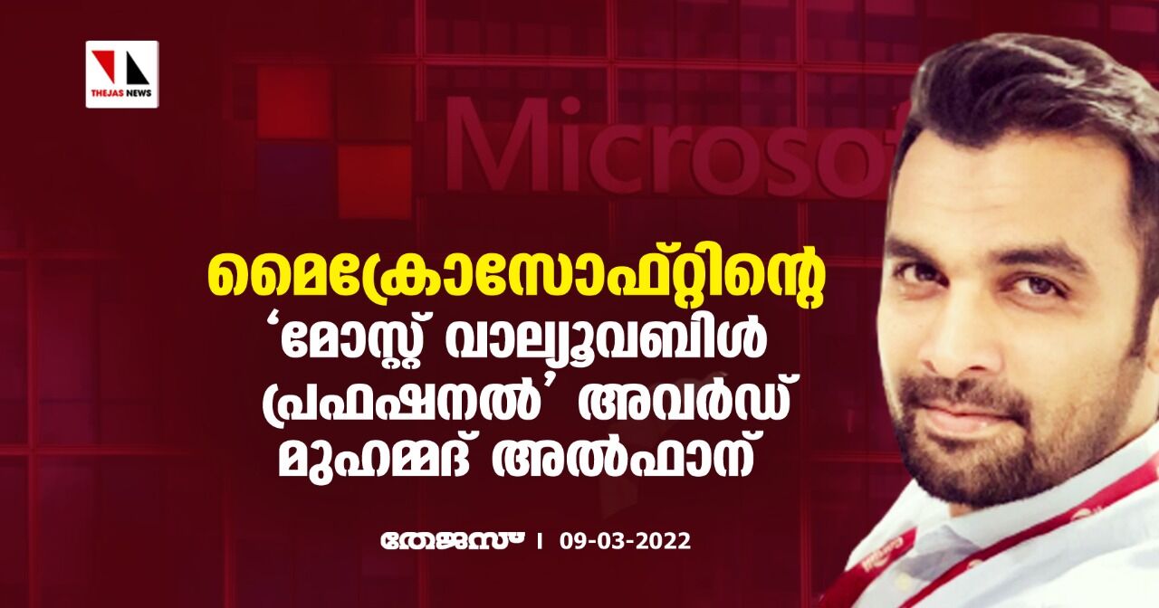 മൈക്രോസോഫ്റ്റിന്റെ 'മോസ്റ്റ് വാല്യൂവബിള് പ്രഫഷനല്' അവര്ഡ് മുഹമ്മദ് അല്ഫാന്