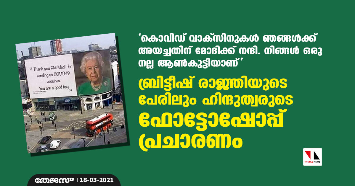 'കൊവിഡ് വാക്സിനുകള് ഞങ്ങള്ക്ക് അയച്ചതിന് മോദിക്ക് നന്ദി. നിങ്ങള് ഒരു നല്ല ആണ്കുട്ടിയാണ്'; ബ്രിട്ടീഷ് രാജ്ഞിയുടെ പേരിലും ഹിന്ദുത്വരുടെ ഫോട്ടോഷോപ്പ് പ്രചാരണം