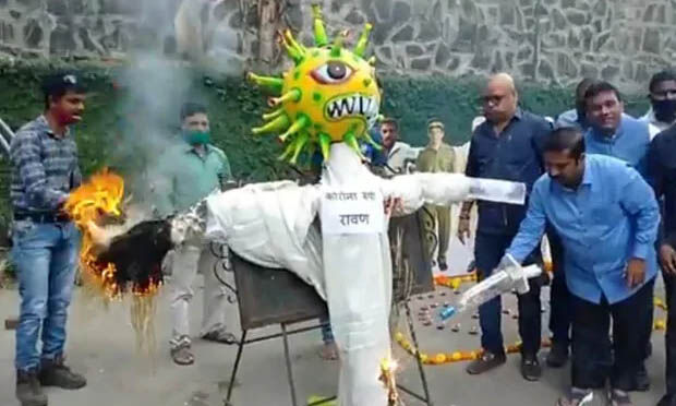 കുത്തിവയ്പ് തുടങ്ങുന്നതിനു മുമ്പ് 'കൊറോണ രാവണനെ' ചുട്ടെരിച്ച് ബിജെപി ആഘോഷം