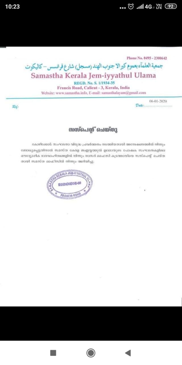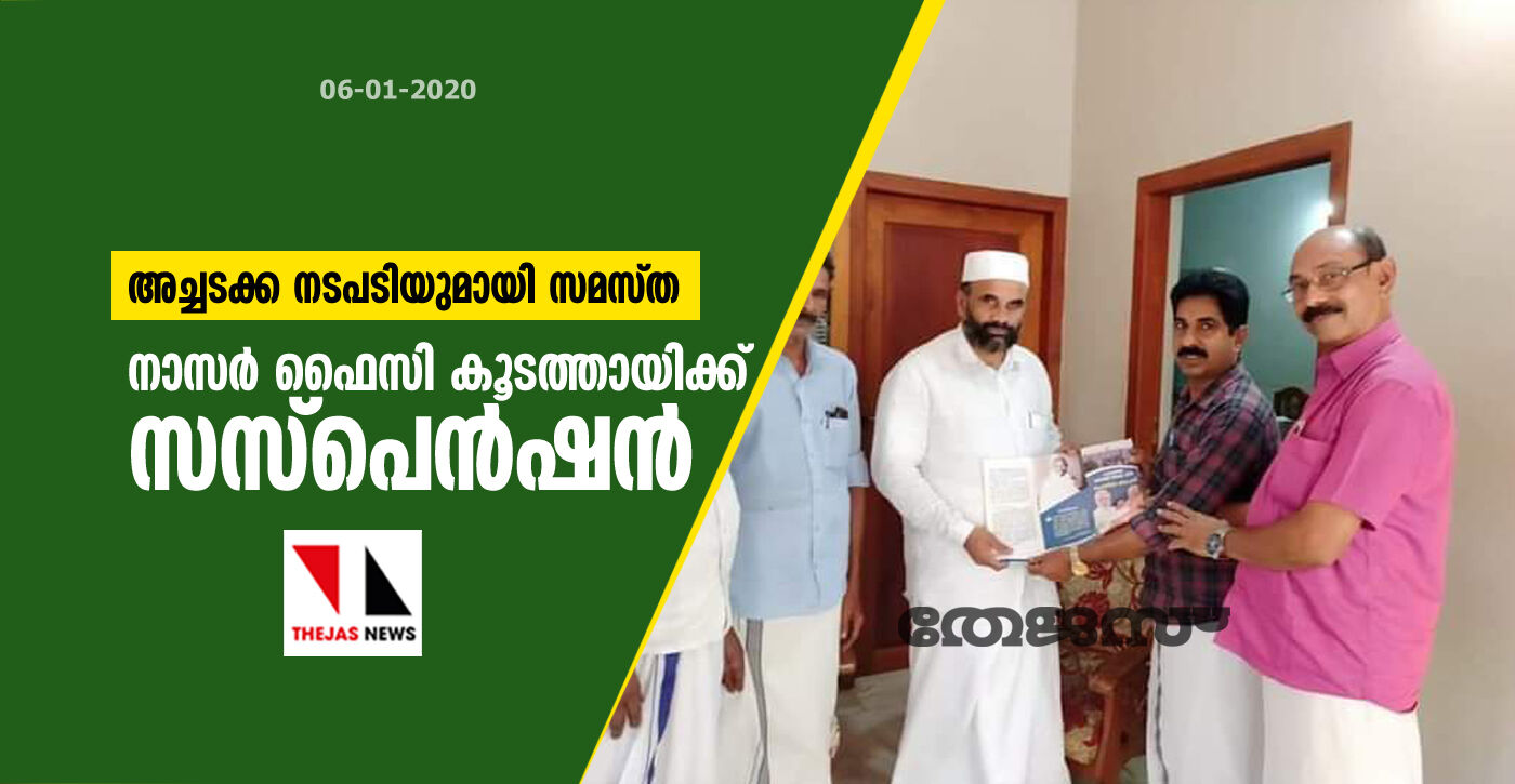 അച്ചടക്ക നടപടിയുമായി സമസ്ത; നാസര് ഫൈസി കൂടത്തായിക്ക് സസ്പെന്ഷന്