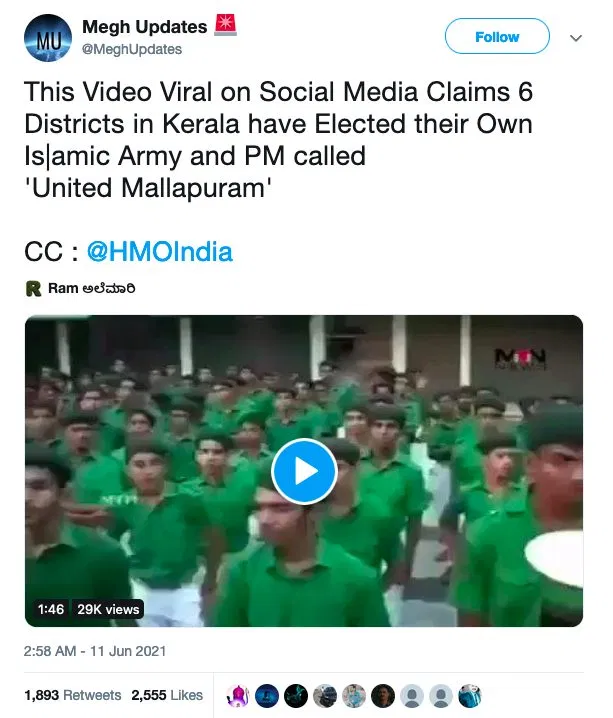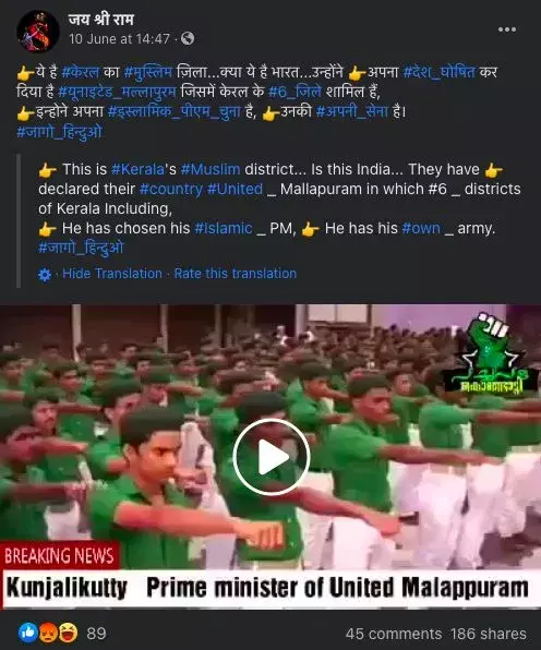 'കേരളത്തില് മുസ്ലിം രാജ്യം രൂപീകരിച്ചു, പ്രധാനമന്ത്രിയേയും സൈന്യത്തേയും തിരഞ്ഞെടുത്തു'; യൂത്ത് ലീഗ് റാലിയുടെ വീഡിയോ ഉപയോഗിച്ച് മലപ്പുറത്തിനെതിരേ വ്യാജ പ്രചാരണം