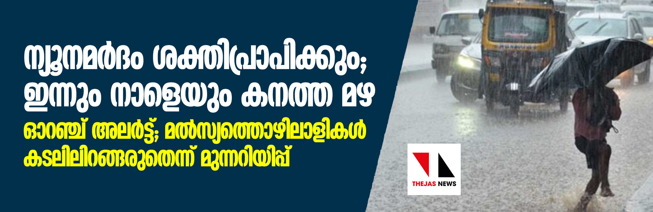 ന്യൂനമര്ദം ശക്തിപ്രാപിക്കും; ഇന്നും നാളെയും കനത്ത മഴ: ഓറഞ്ച് അലര്ട്ട്; മല്സ്യത്തൊഴിലാളികള് കടലിലിറങ്ങരുതെന്ന് മുന്നറിയിപ്പ്