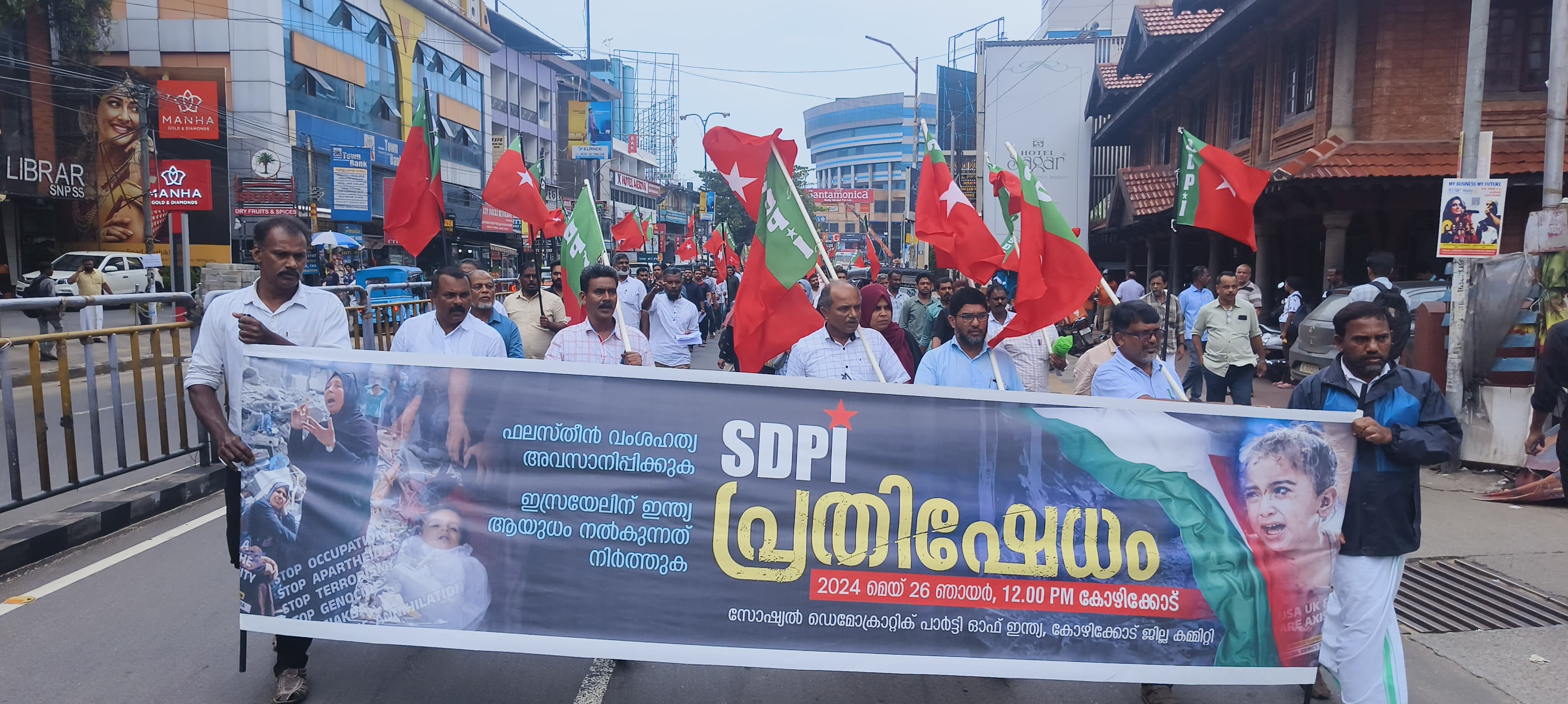 കോഴിക്കോട്: 'ഫലസ്തീനിലെ വംശഹത്യ അവസാനിപ്പിക്കുക ഇസ്രായേലിന് ഇന്ത്യ ആയുധം നല്കുന്നത് നിര്ത്തലാക്കുക' എന്നീ ആവശ്യങ്ങള് ഉന്നയിച്ച് എസ്ഡിപിഐ കോഴിക്കോട് ജില്ലാ കമ്മിറ്റി നഗരത്തില് റാലിയും പ്രതിഷേധ സംഗമവും സംഘടിപ്പിച്ചു. ജില്ലാ ജനറല് സെക്രട്ടറി എന്.കെ റഷീദ് ഉമരി പ്രതിഷേധ സംഗമം ഉദ്ഘാടനം നിര്വഹിച്ചു. വൈസ് പ്രസിഡന്റ് വാഹിദ് ചെറുവറ്റ, സെക്രട്ടറി പി.ടി അഹമദ്, ജില്ലാ കമ്മിറ്റിയംഗം എഞ്ചിനീയര് എം.എ സലീം, ടിപി മുഹമ്മദ് തുടങ്ങിയവര് സംസാരിച്ചു.