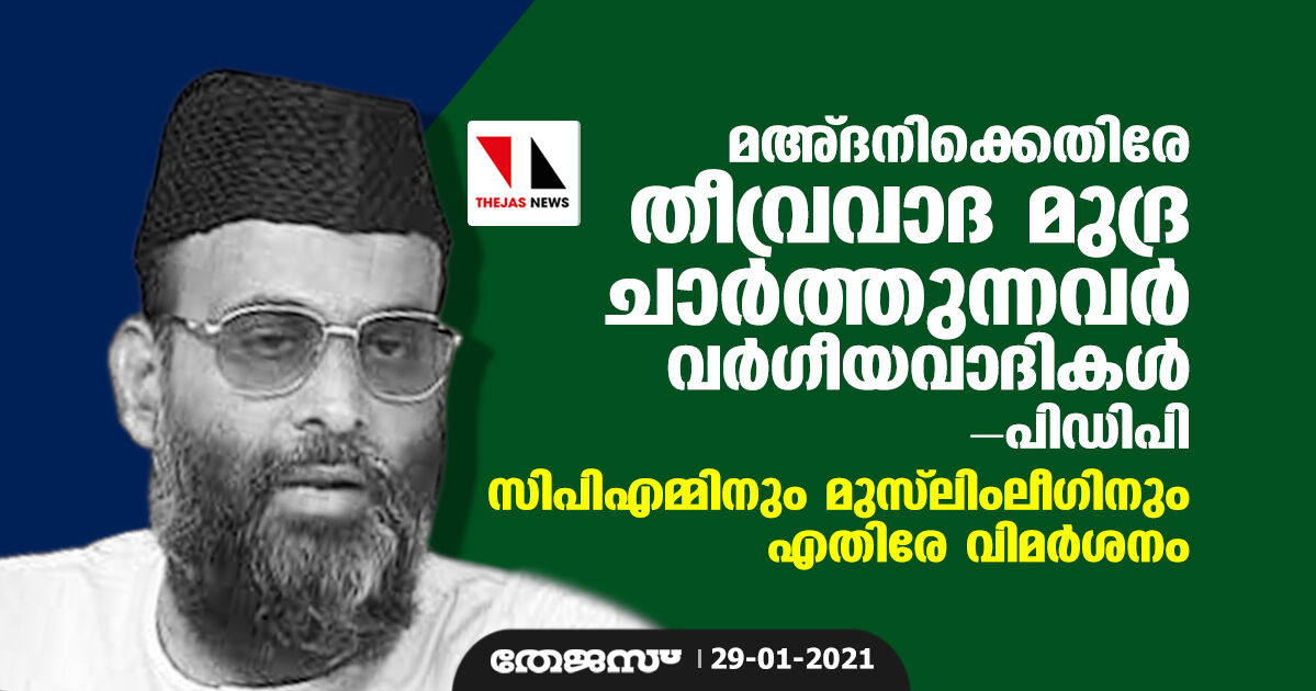 കഴിഞ്ഞ രണ്ട് പതിറ്റാണ്ടിലധികമായി അന്യായമായി കാരാഗൃഹത്തിലടക്കപ്പെട്ട മഅ്ദനിയുടെ കാര്യത്തില് ഒരു ഇടപെടലും നടത്താന് ശ്രമിക്കാത്തവര് അവസരം കിട്ടുമ്പോഴെല്ലാം മഅ്ദനിയെ തീവ്രവാദിയാക്കാന് മത്സരിക്കുന്നത് പൊതുസമൂഹം തിരിച്ചറിയുന്നുണ്ട്. എല്ഡിഎഫ് കണ്വീനര് എ വിജയരാഘവന് നാഴികക്ക് നാല്പത് വട്ടം വര്ഗീയത വിളിച്ച് പറയുന്നത് വെടക്കാക്കി തനിക്കാക്കുക എന്ന ഉദ്ദേശത്തോടെയാണ്. അതിനെ രാഷ്ട്രീയമായി പ്രതിരോധിക്കാന് കഴിയാത്ത ലീഗ് കോണ്ഗ്രസ് നേതാക്കള് മറുപടിയായി മഅ്ദനിയെ വലിച്ചിഴച്ച് തൂക്കമൊപ്പിക്കാന് ശ്രമിക്കുന്നത് ഇനിയും അനുവദിച്ച് കൊടുക്കാന് കഴിയില്ല.