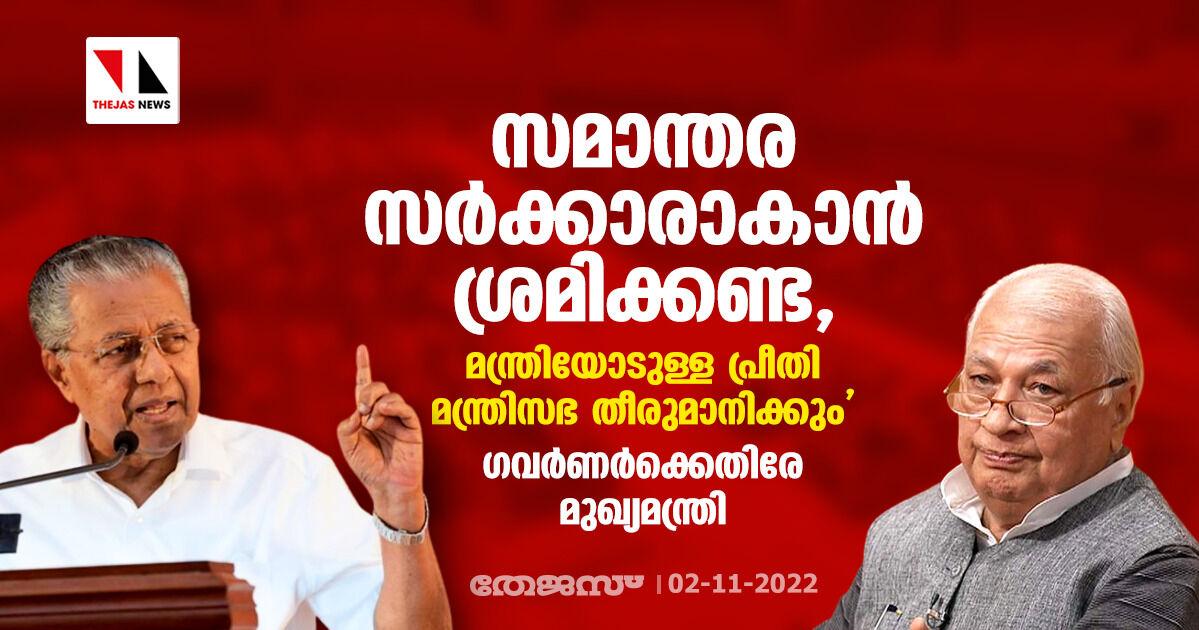 സമാന്തര സർക്കാരാകാൻ ശ്രമിക്കണ്ട, മന്ത്രിയോടുള്ള പ്രീതി മന്ത്രിസഭ തീരുമാനിക്കും'; ഗവർണർക്കെതിരേ മുഖ്യമന്ത്രി