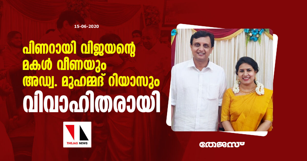 തിരുവനന്തപുരം: മുഖ്യമന്ത്രി പിണറായി വിജയന്റെ മകള് വീണയും ഡിവൈഎഫ്ഐ ദേശീയ പ്രസിഡന്റ് അഡ്വ. മുഹമ്മദ് റിയാസും വിവാഹിതരായി. ക്ലിഫ് ഹൗസില് ലളിതമായ ചടങ്ങിലായിരുന്നു വിവാഹം. കൊവിഡ് പ്രോട്ടോക്കോള് അനുസരിച്ച് 50ല് താഴെ ആളുകള് മാത്രം പങ്കെടുത്തായിരുന്നു ചടങ്ങ്.