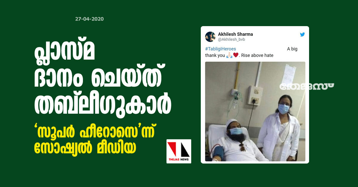 പ്ലാസ്മ ദാനം ചെയ്ത് തബ് ലീഗുകാര്; 'സൂപര് ഹീറോ'സെന്ന് സോഷ്യല് മീഡിയ