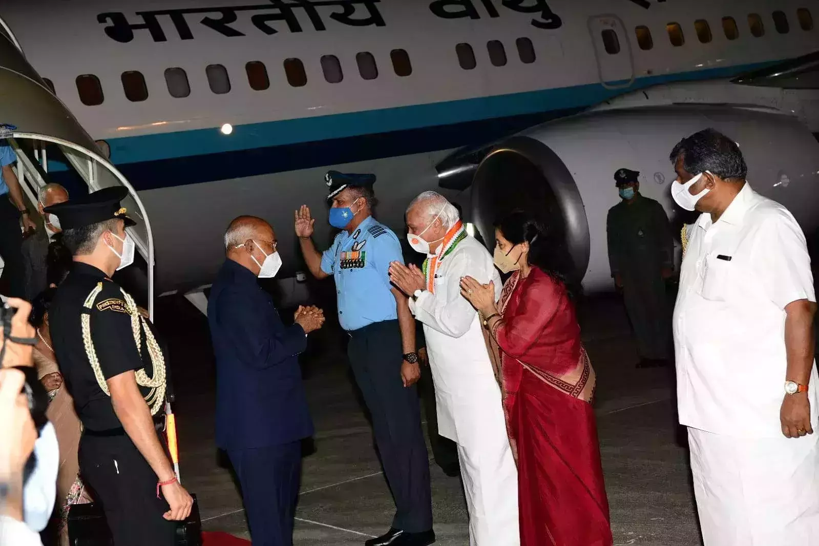വ്യോമസേനയുടെ പ്രത്യേക വിമാനത്തില് രാത്രി 8.40നു തിരുവനന്തപുരത്തെത്തിയ രാഷ്ട്രപതിയെ ഗവര്ണര് ആരിഫ് മുഹമ്മദ് ഖാന്, ഗതാഗത മന്ത്രി ആന്റണി രാജു, മേയര് ആര്യ രാജേന്ദ്രന്, ചീഫ് സെക്രട്ടറി വി പി ജോയി എന്നിവര് ചേര്ന്ന് സ്വീകരിച്ചു.