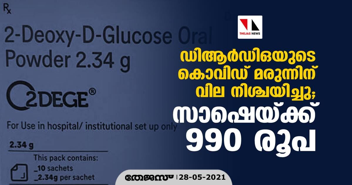 ന്യൂഡൽഹി: ഡിആർഡിഒ വികസിപ്പിച്ച കൊവിഡ് മരുന്നായ 2 ഡി ഓക്സി ഡി ഗ്ലൂക്കോസിന് വില നിശ്ചയിച്ചു. ഒരു സാഷെയ്ക്ക് 990 രൂപയാണ് വില. എന്നാൽ കേന്ദ്ര സംസ്ഥാന സർക്കാരുകൾക്ക് വിലക്കുറവിൽ മരുന്ന് ലഭ്യമാക്കും.