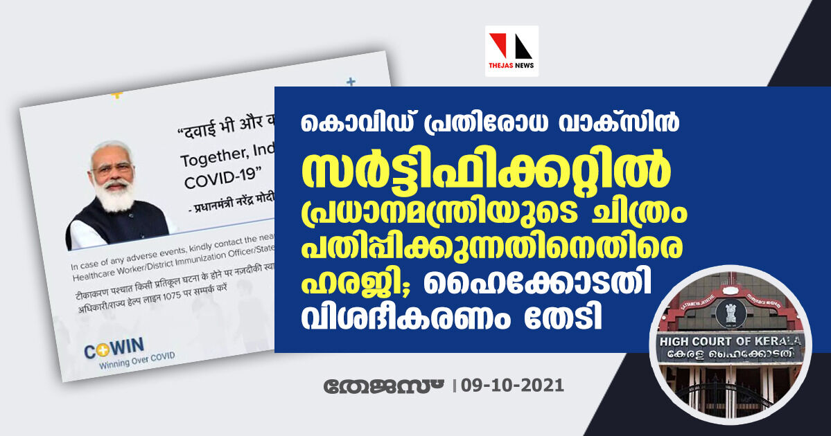 കൊവിഡ് പ്രതിരോധ വാക്സിന്:സര്ട്ടിഫിക്കറ്റില് പ്രധാനമന്ത്രിയുടെ ചിത്രം പതിപ്പിക്കുന്നതിനെതിരെ ഹരജി; ഹൈക്കോടതി വിശദീകരണം തേടി