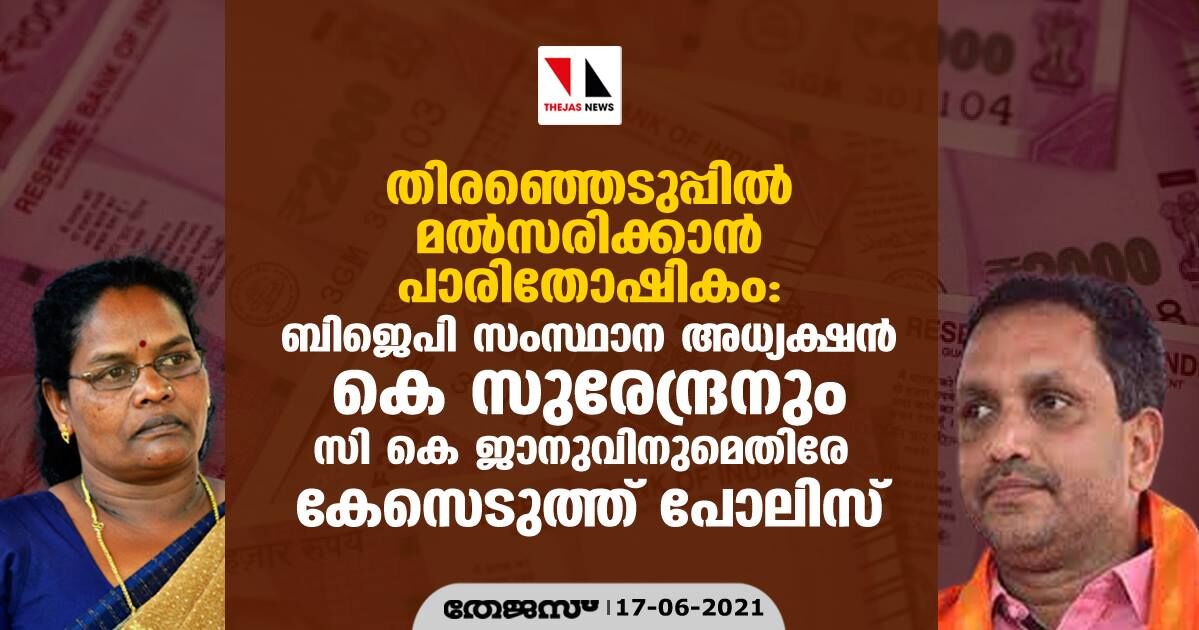 തിരഞ്ഞെടുപ്പില് മല്സരിക്കാന് പാരിതോഷികം: ബിജെപി സംസ്ഥാന അധ്യക്ഷന് കെ സുരേന്ദ്രനും സി കെ ജാനുവിനുമെതിരേ കേസെടുത്ത് പോലിസ്