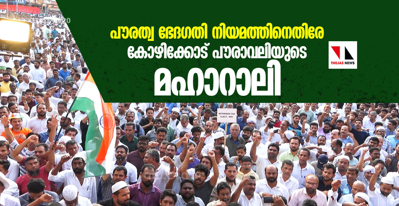 കോഴിക്കോട്: പൗരത്വനിയമ ഭേദഗതിക്കെതിരെ കോഴിക്കോട് പൗരാവലി സംഘടിപ്പിച്ച മഹാറാലിയില് പതിനായിരങ്ങള് അണിനിരന്നു. പൗരത്വ ഭേദഗതി നിയമവും ദേശീയ പൗരത്വ രജിസ്റ്ററും അടിച്ചേല്പ്പിക്കാനുള്ള ഭരണകൂടത്തിന്റെ നീക്കങ്ങള്ക്കെതിരേ കോഴിക്കോട്ടുകാരുടെ ശക്തമായ പ്രതിഷേധമായിമാറി മഹാറാലി. വിവിധ രാഷ്ട്രീയപാര്ട്ടി പ്രതിനിധികളും സാമൂഹിക, സാംസ്കാരികരംഗത്തെ പ്രമുഖരും വിദ്യാര്ത്ഥികളും തൊഴിലാളികളും സ്ത്രീകളും റാലിയില് അണിനിരന്നു.