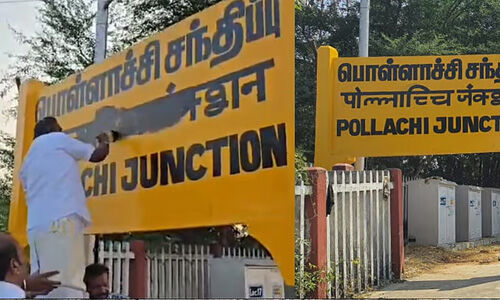 ഹിന്ദി അടിച്ചേല്പ്പിക്കുന്നതിനെതിരെ തമിഴ്നാട്ടില് പ്രതിഷേധം കനക്കുന്നു; പൊളളാച്ചി റെയില്വേ സ്റ്റേഷന് ബോര്ഡിലെ ഹിന്ദി എഴുത്ത് മായ്ച്ചു