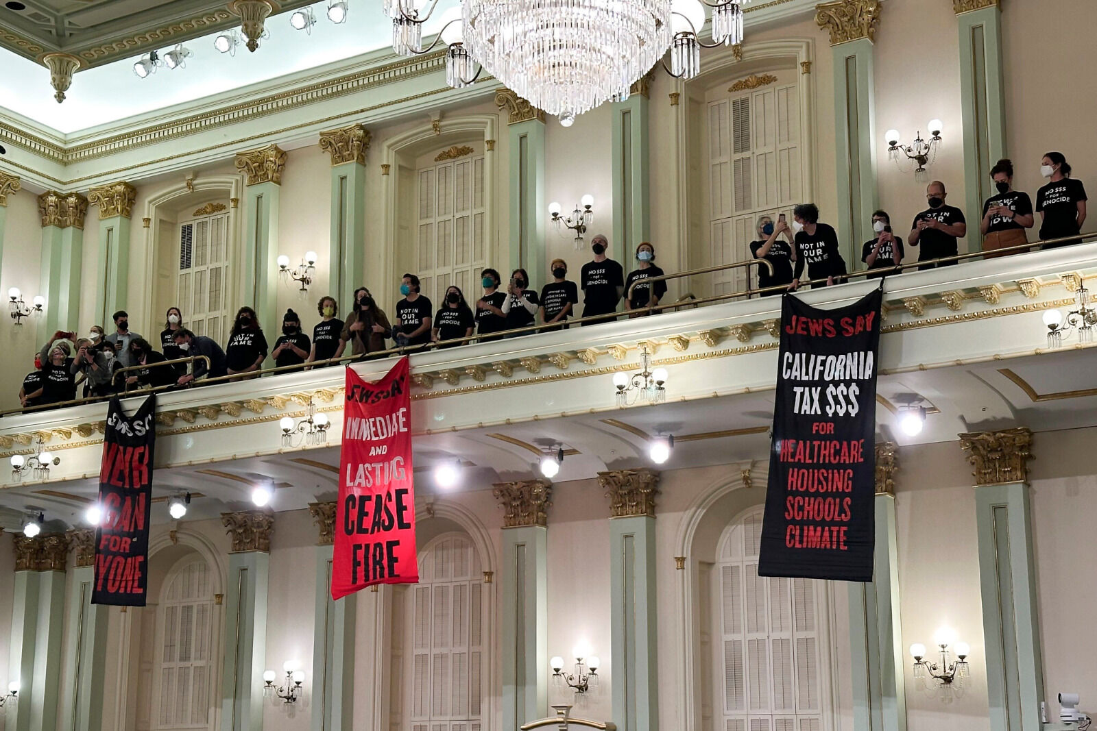 മൊബൈല് ഫോണിലെ ഫ്ലാഷ്ലൈറ്റുകള് ഉയര്ത്തുകയും ചെയ്തു. ജുയിഷ് വോയ്സ് ഫോര് പീസ്, ഇഫ് നോട്ട് നൗ, ഇന്റര്നാഷനല് ജൂയിഷ് ആന്റി സയണിസ്റ്റ് നെറ്റ്വര്ക്ക് തുടങ്ങിയ സംഘങ്ങളാണ് പ്രതിഷേധം സംഘടിപ്പിച്ചത്. 'ഞങ്ങള് ജൂതന്മാരും കാലിഫോര്ണിയക്കാരുമാണ്. അസംബ്ലി അംഗങ്ങളാണ്. ഇപ്പോള് വെടിനിര്ത്തല് ആവശ്യപ്പെടുന്നതില് ഞങ്ങളോടൊപ്പം ചേരാന് നിങ്ങളോട് ആവശ്യപ്പെടുന്നു എന്നാണ് പറഞ്ഞത്.