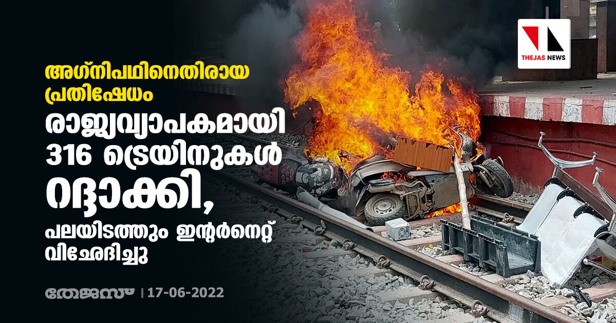 അഗ്നിപഥിനെതിരായ പ്രതിഷേധം; രാജ്യവ്യാപകമായി 316 ട്രെയിനുകള് റദ്ദാക്കി, പലയിടത്തും ഇന്റര്നെറ്റ് വിഛേദിച്ചു