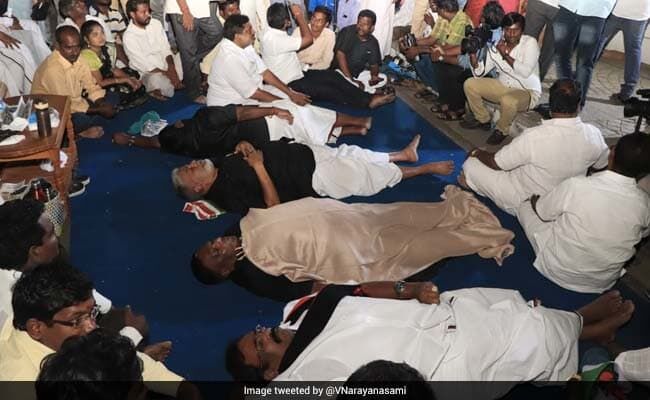 ബുധനാഴ്ച രാത്രി മുതല് ഗവര്ണറുടെ ഔദ്യോഗിക വസതിയായ രാജ് നിവാസിന് മുന്നിലാണ് മുഖ്യമന്ത്രിയും മന്ത്രിമാരും പാര്ട്ടി നേതാക്കളും കുത്തിയിരിപ്പ് സമരം നടത്തിവരുന്നത്.ഭരണകക്ഷിയായ ഡിഎംകെയുടെ എംഎല്എമാരും മുഖ്യമന്ത്രിക്കൊപ്പം സമരത്തിനിറങ്ങി.