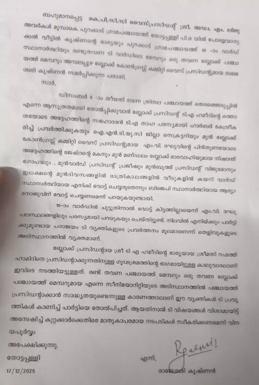 ഇത് തടയാനായി കോണ്ഗ്രസിലെ ഒരു വിഭാഗം ബിജെപി സ്ഥാനാര്ഥികള്ക്ക് വേണ്ടി പ്രചാരണം നടത്തിയെന്നാണ് ആരോപണം. കോണ്ഗ്രസ് അമ്പലപ്പുഴ ബ്ലോക്ക് പ്രസിഡന്റ് ടി എ ഹമീദിന്റെ ആശിര്വാദത്തോടെ അദേഹത്തിന്റെ സഹോദരന് ടി എ താഹ, ഐഎന്ടിയുസി ജില്ലാ സെക്രട്ടറി എം വി രഘു, നിഷാന്ത് ഗോപാല്, പ്രാദേശിക നേതാക്കളായ പ്രജീഷ്, വിജുമോന് എന്നിവര് ബിജെപിക്ക് വേണ്ടി പ്രചാരണം നടത്തിയെന്നാണ് കത്ത് ആരോപിക്കുന്നത്. തോട്ടപ്പള്ളി ഹാര്ബര് മേഖലയിലെ വീടുകളില് കയറി ബിജെപി സ്ഥാനാര്ഥിക്ക് വോട്ട് ചെയ്യണം എന്ന് ആവശ്യപ്പെട്ടുവെന്നും പരാതി ആരോപിക്കുന്നു. തിരഞ്ഞെടുപ്പില് രാജേശ്വരി കൃഷ്ണന് പരാജയപ്പെടുകയും അവിടെ ബിജെപി സ്ഥാനാര്ഥി ആര്യ നോജു വിജയിക്കുകയും ചെയ്തു.
