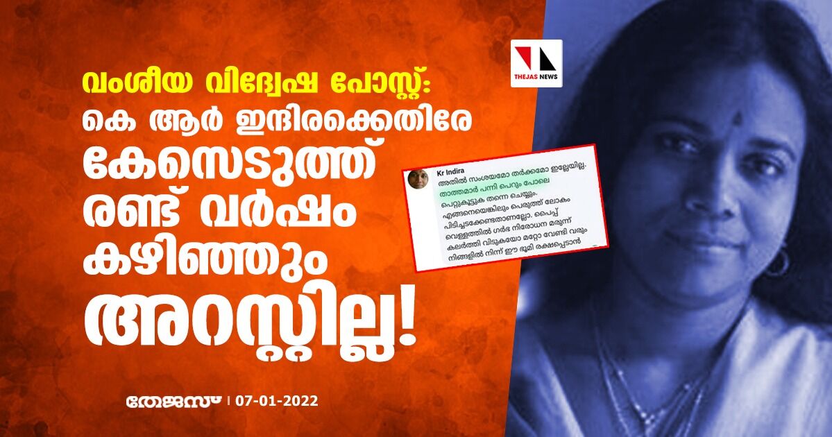 വംശീയ വിദ്വേഷ പോസ്റ്റ്: കെ ആർ ഇന്ദിരക്കെതിരേ കേസെടുത്ത് രണ്ട് വർഷം കഴിഞ്ഞും അറസ്റ്റില്ല!