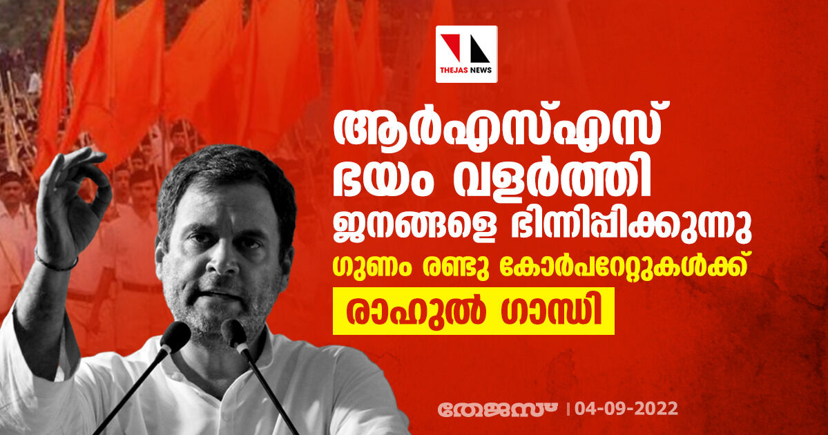 ആര്എസ്എസ് ഭയം വളര്ത്തി ജനങ്ങളെ ഭിന്നിപ്പിക്കുന്നു; ഗുണം രണ്ടു കോർപറേറ്റുകൾക്ക്: രാഹുല് ഗാന്ധി