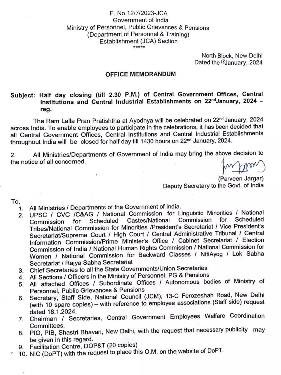 രാമക്ഷേത്ര ഉദ്ഘാടനം: കേന്ദ്ര സര്ക്കാര് ജീവനക്കാര്ക്ക് ജനുവരി 22ന് അര്ധ അവധി