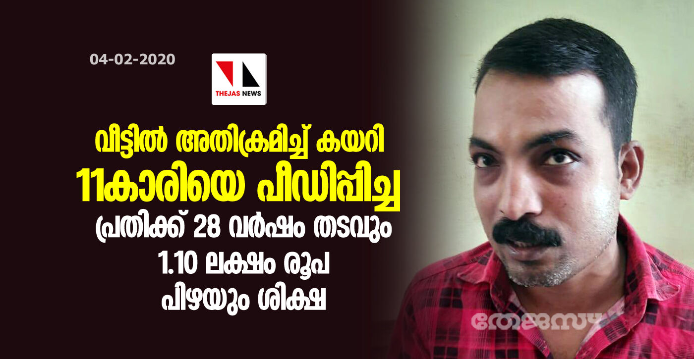 വീട്ടില് അതിക്രമിച്ച് കയറി 11കാരിയെ പീഡിപ്പിച്ച പ്രതിക്ക് 28 വര്ഷം തടവും 1.10 ലക്ഷം രൂപ പിഴയും ശിക്ഷ