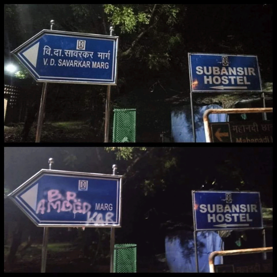 'സവര്ക്കര് റോഡ്' മണിക്കൂറുകള്ക്കുള്ളില് 'അംബേദ്കര് റോഡ്'; ജെഎന്യുവില് സവര്ക്കര്ക്ക് ഇടമില്ലെന്ന് വിദ്യാര്ഥികള്