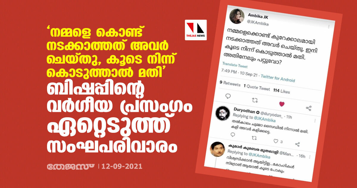 'നമ്മളെ കൊണ്ട് നടക്കാത്തത് അവര് ചെയ്തു, കൂടെ നിന്ന് കൊടുത്താല് മതി'; ബിഷപ്പിന്റെ വര്ഗീയ പ്രസംഗം ഏറ്റെടുത്ത് സംഘപരിവാരം