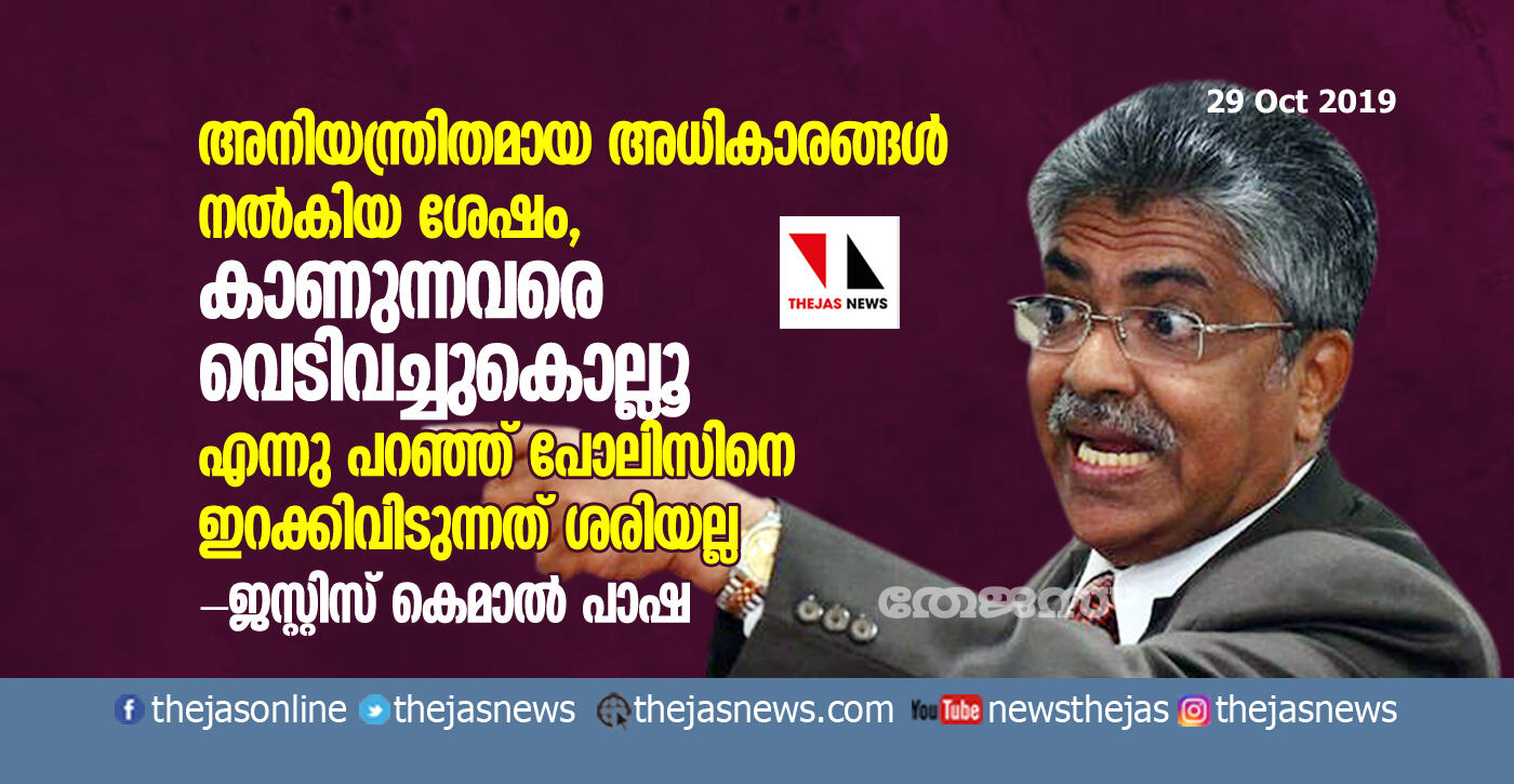 അധികാരങ്ങള് നല്കിയ ശേഷം, കാണുന്നവരെ വെടിവച്ചുകൊല്ലൂ എന്നുപറഞ്ഞ് പോലിസിനെ ഇറക്കിവിടുന്നത് ശരിയല്ല: ജസ്റ്റിസ് കെമാല് പാഷ