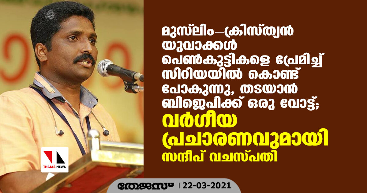 മുസ്ലിം-ക്രിസ്ത്യന് യുവാക്കള് പെണ്കുട്ടികളെ പ്രേമിച്ച് സിറിയയില് കൊണ്ട് പോകുന്നു, തടയാന് ബിജെപിക്ക് ഒരു വോട്ട്; വര്ഗീയ പ്രചാരണവുമായി സന്ദീപ് വചസ്പതി