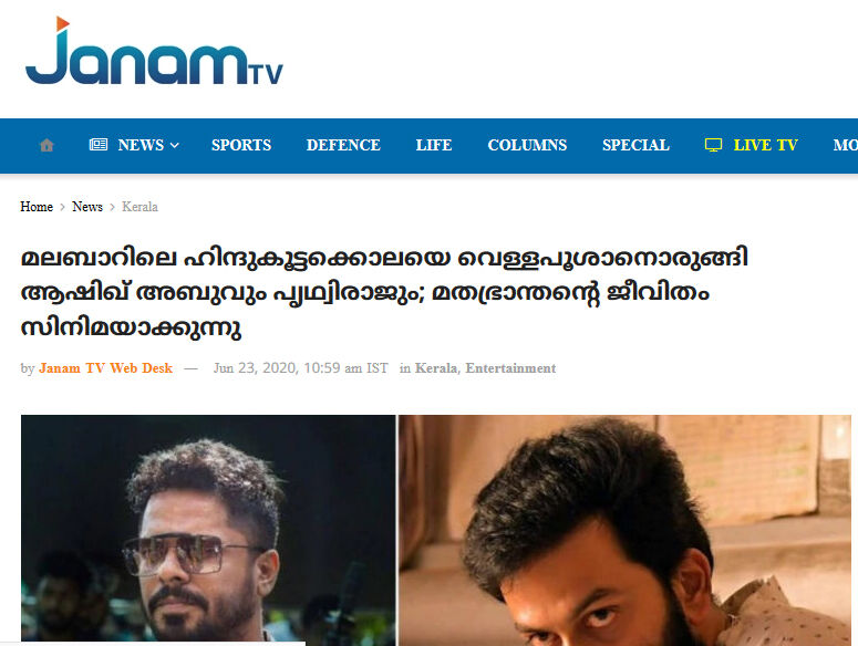 കോഴിക്കോട്: സ്വാതന്ത്ര്യ സമരപോരാട്ടാത്തിലെ തിളങ്ങുന്ന അധ്യായമായ മലബാര് കലാപത്തിനു നേതൃത്വം നല്കിയ ഖിലാഫത്ത് നേതാവ് വാരിയന് കുന്നത്ത് കുഞ്ഞഹമ്മദ് ഹാജിയെ മതഭ്രാന്തനാക്കി സംഘപരിവാര ചാനല്. 1921ല് ചരിത്രത്തെ സിനിമയാക്കുന്നുവെന്ന വാര്ത്തകള്ക്കിടെയാണ് ദീരദേശാഭിമാനിയായ വാരിയന് കുന്നനെ മതഭ്രാന്തനെന്നു ഹിന്ദുകൂട്ടക്കൊലയ്ക്കു നേതൃത്വം നല്കിയയാളെന്നുമുള്ള പച്ചനുണയുമായി ജനം ടിവി രംഗത്തെത്തിയത്. പൃഥ്വിരാജ് നായകനായി ആഷിഖ് അബു സംവിധാനം ചെയ്യുന്ന വാരിയംകുന്നന് എന്ന സിനിമയെ കുറിച്ച് പൃഥ്വിരാജ് സാമൂഹികമാധ്യമങ്ങളിലൂടെ അറിയിച്ചതോടെ സംഘപരിവാര കേന്ദ്രങ്ങള് സംഘടിതമായി സൈബര് ആക്രമണങ്ങളുമായി രംഗത്തുണ്ട്. അസഭ്യം ചൊരിഞ്ഞും ഭീഷണിപ്പെടുത്തിയുമുള്ള നിരവധി കമ്മന്റുകളാണ് സൈബറിടങ്ങളിലുള്ളത്. ഇതിനിടെയാണ് 'മലബാറിലെ ഹിന്ദുകൂട്ടക്കൊലയെ വെള്ളപൂശാനൊരുങ്ങി ആഷിഖ് അബുവും പൃഥ്വിരാജും; മതഭ്രാന്തന്റെ ജീവിതം സിനിമയാക്കുന്നു' എന്ന തലക്കെട്ടില് ജനം ടിവി ഓണ്ലൈനില് വാര്ത്ത നല്കിയിട്ടുള്ളത്.