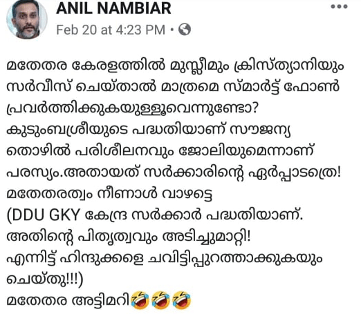 'മതേതര കേരളത്തില് മുസ് ലിമും ക്രിസ്ത്യാനിയും സര്വീസ് ചെയ്താല് മാത്രമെ സ്മാര്ട്ട് ഫോണ് പ്രവര്ത്തിക്കുകയുള്ളൂവെന്നുണ്ടോ?. കുടുംബശ്രീയുടെ പദ്ധതിയാണ് സൗജന്യ തൊഴില് പരിശീലനവും ജോലിയുമെന്നാണ് പരസ്യം. അതായത് സര്ക്കാരിന്റെ ഏര്പാടത്രെ!. മതേതരത്വം നീണാള് വാഴട്ടെ. (DDU GKY കേന്ദ്ര സര്ക്കാര് പദ്ധതിയാണ്. അതിന്റെ പിതൃത്വവും അടിച്ചുമാറ്റി! എന്നിട്ട് ഹിന്ദുക്കളെ ചവിട്ടിപ്പുറത്താക്കുകയും ചെയ്തു!!!). മതേതര അട്ടിമറി'. ഇതായിരുന്നു അനില് നമ്പ്യാരുടെ ഫേസ്ബുക്ക് പോസ്റ്റ്. സംവരണ സീറ്റിലേക്ക് അപേക്ഷ ക്ഷണിച്ച് കൊണ്ടുള്ള പത്ര പരസ്യത്തിന്റെ കട്ടിങ്ങും ഇതോടൊപ്പം ചേര്ത്ത് കൊണ്ടായിരുന്നു നമ്പ്യാരുടെ വര്ഗീയ പ്രചാരണം.