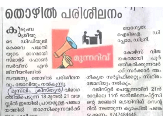 ഡിഡിയുജികെവൈ പദ്ധതിയില് മൂന്ന്, ആറ്, ഒമ്പത്, പന്ത്രണ്ട് മാസ കാലയളവില് വിവിധ തൊഴിലധിഷ്ഠിത കോഴ്സുകള് നടത്തുന്നുണ്ട്. ഇവയൊന്നും പ്രത്യേക മതവിഭാഗത്തിന് മാത്രമായല്ല. പട്ടികജാതി, പട്ടിക വര്ഗ വിഭാഗങ്ങള്ക്ക് 50ഉം, ന്യൂനപക്ഷ വിഭാഗങ്ങള്ക്ക് 15ഉം ശതമാനമാണ് കേന്ദ്രസര്ക്കാര് നിര്ദേശിക്കുന്ന സംവരണം. ശാരീരിക അവശതകള് അനുഭവിക്കുന്നവര്ക്ക് മൂന്ന് ശതമാനം സംവരണം സംസ്ഥാന സര്ക്കാരുകള് ഉറപ്പ് വരുത്തണം. കോഴ്സിന് ചേരുന്നവരില് മൂന്നിലൊന്ന് സ്ത്രീകള് ആയിരിക്കണമെന്നും കേന്ദ്ര നിര്ദേശമുണ്ട്. കേന്ദ്രസര്ക്കാര് നിര്ദേശ പ്രകാരമുള്ള സംവരണ ഒഴിവുകള് നികത്താന് നല്കിയ പത്രപരസ്യമാണ് സംഘപരിവാര് വര്ഗീയ വിദ്വേഷം വളര്ത്താന് ദുരുപയോഗിച്ചത്. ഇതിനെ പൊളിച്ചടുക്കി സാമൂഹിക മാധ്യമങ്ങളില് പോസ്റ്റുകള് വന്നതോടെ വര്ഗീയ പ്രചാരണം നടത്തിയവര് പലരും പോസ്റ്റുകള് പിന്വലിച്ചു.
