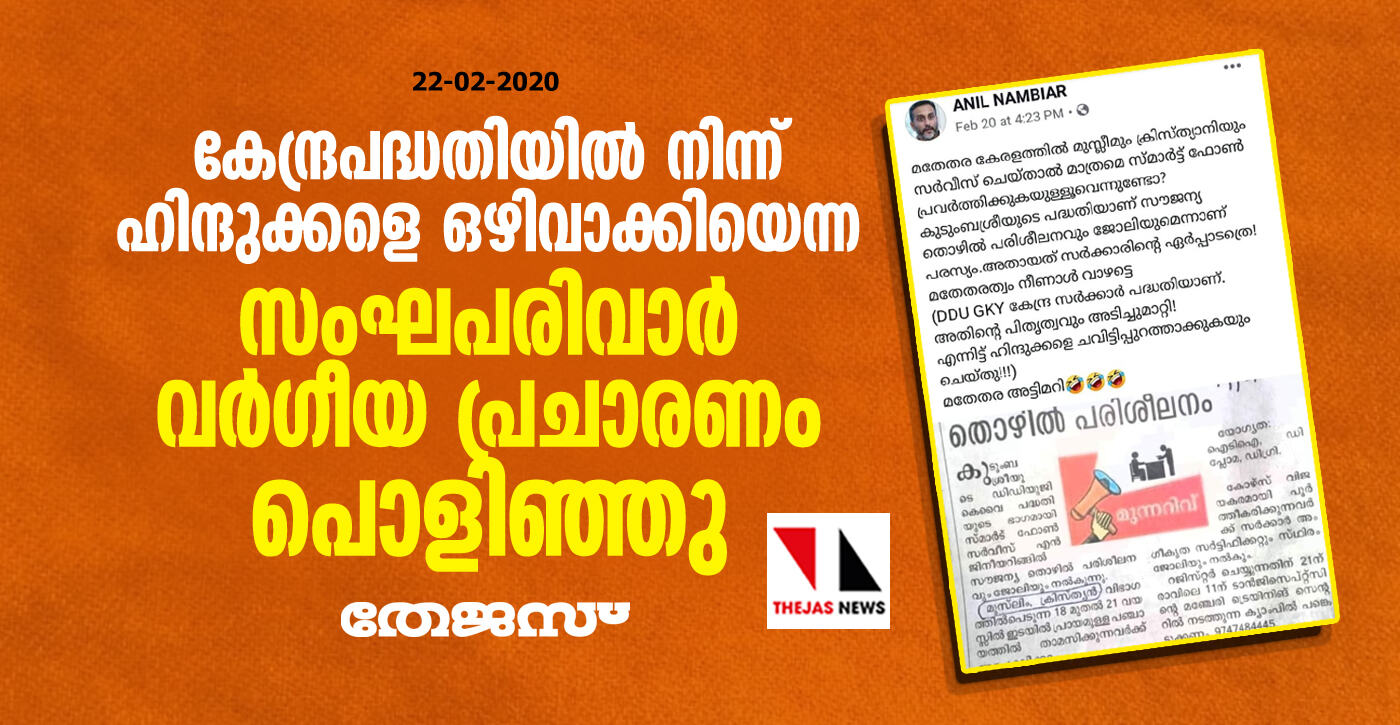 'കേന്ദ്ര പദ്ധതിയായ ഡിഡിയുജികെവൈ കേരളത്തിലെത്തിയപ്പോള് ഹിന്ദുക്കള് പുറത്ത്, ഇതില് അപേക്ഷിക്കാവുന്നത് 18 മുതല് 21 വയസ് വരെ പ്രായമുള്ള ക്രിസ്ത്യന്, മുസ് ലിം കുട്ടികള്ക്ക് മാത്രമാണ്. ഹിന്ദു പെണ്കുട്ടികളെ പ്രധാനമന്ത്രിയുടെ ഈ പദ്ധതിയില്നിന്ന് കേരളം ഒഴിവാക്കി'. എന്നായിരുന്നു മറ്റുചില സംഘപരിവാര് പ്രൊഫൈലുകളില് നിന്നുള്ള പ്രചാരണം. ചില സംഘപരിവാര് അനുകൂല ഓണ്ലൈന് ന്യൂസ് പോര്ട്ടലുകളും വര്ഗീയ പ്രചാരണം ഏറ്റെടുത്തു.