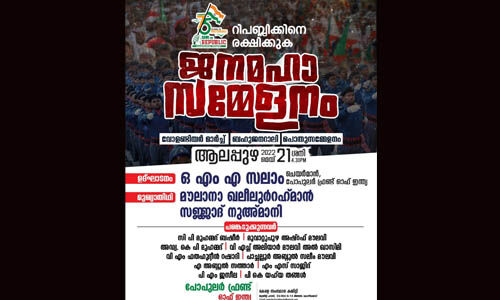 ആലപ്പുഴ: 'റിപബ്ലിക്കിനെ രക്ഷിക്കുക' എന്ന പ്രമേയത്തില് പോപുലര് ഫ്രണ്ട് ഓഫ് ഇന്ത്യ സംഘടിപ്പിക്കുന്ന ജനമഹാ സമ്മേളനം 21ന് ആലപ്പുഴയില് നടക്കും. വോളണ്ടിയര് മാര്ച്ച്, ബഹുജന റാലി, പൊതുസമ്മേളനം എന്നിങ്ങനെയാണ് ജനമഹാസമ്മേളനം അരങ്ങേറുന്നത്. പൊതുസമ്മേളനം പോപുലര് ഫ്രണ്ട് ചെയര്മാന് ഒ എം എ സലാം ഉദ്ഘാടനം ചെയ്യും. മൗലാന ഖലീലുര്റഹ്മാന് സജ്ജാദ് നുഅ്മാനി മുഖ്യാതിഥി ആയിരിക്കും.