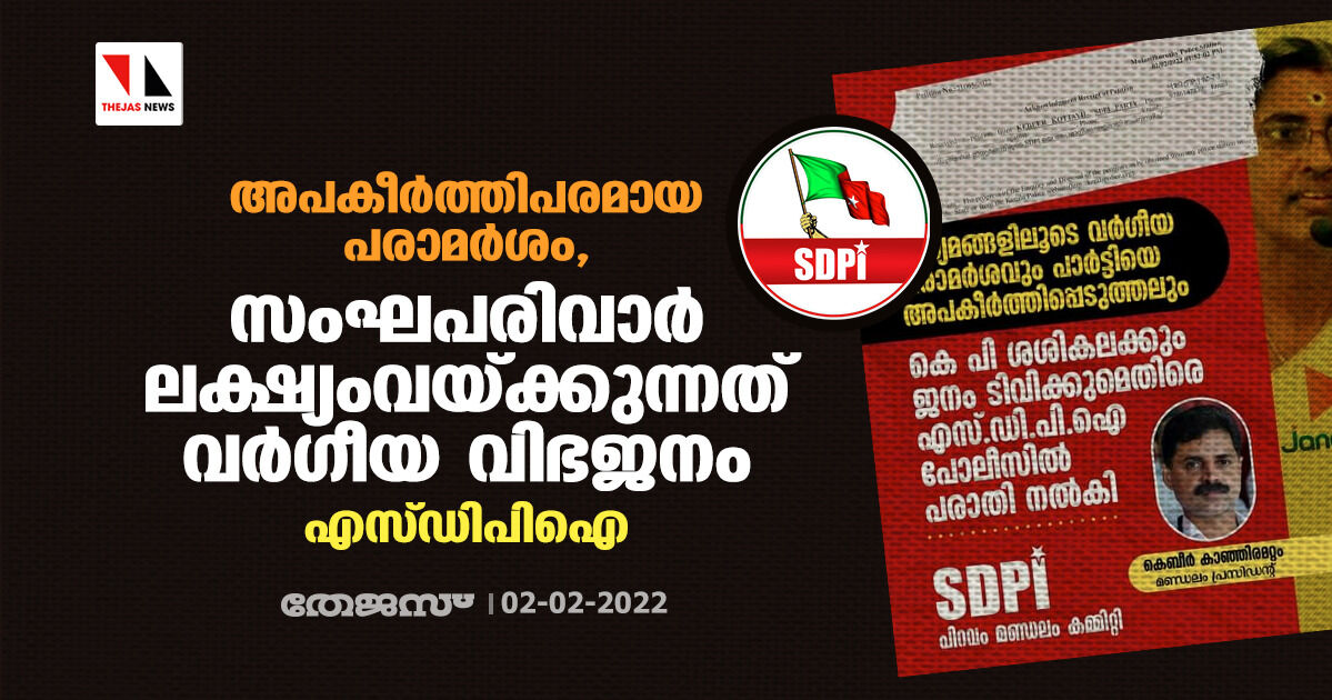 അപകീര്ത്തിപരമായ പരാമര്ശം ; സംഘപരിവാര് ലക്ഷ്യം വെക്കുന്നത് വര്ഗീയ വിഭജനം :എസ്ഡിപിഐ