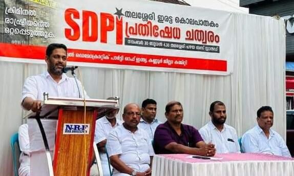 തലശ്ശേരിയിലെ ഇരട്ട കൊലപാതകത്തിനെതിരെ എസ് ഡി പി ഐ കണ്ണൂർ ജില്ലാ കമ്മിറ്റി തലശ്ശേരി പഴയ ബസ് സ്റ്റാന്റ് പരിസരത്ത് നടത്തിയ 'പ്രതിഷേധ ചത്വരം' ഉദ്ഘാടനം ചെയ്തു സംസാരിക്കുകയിരുന്നു അദ്ദേഹം.