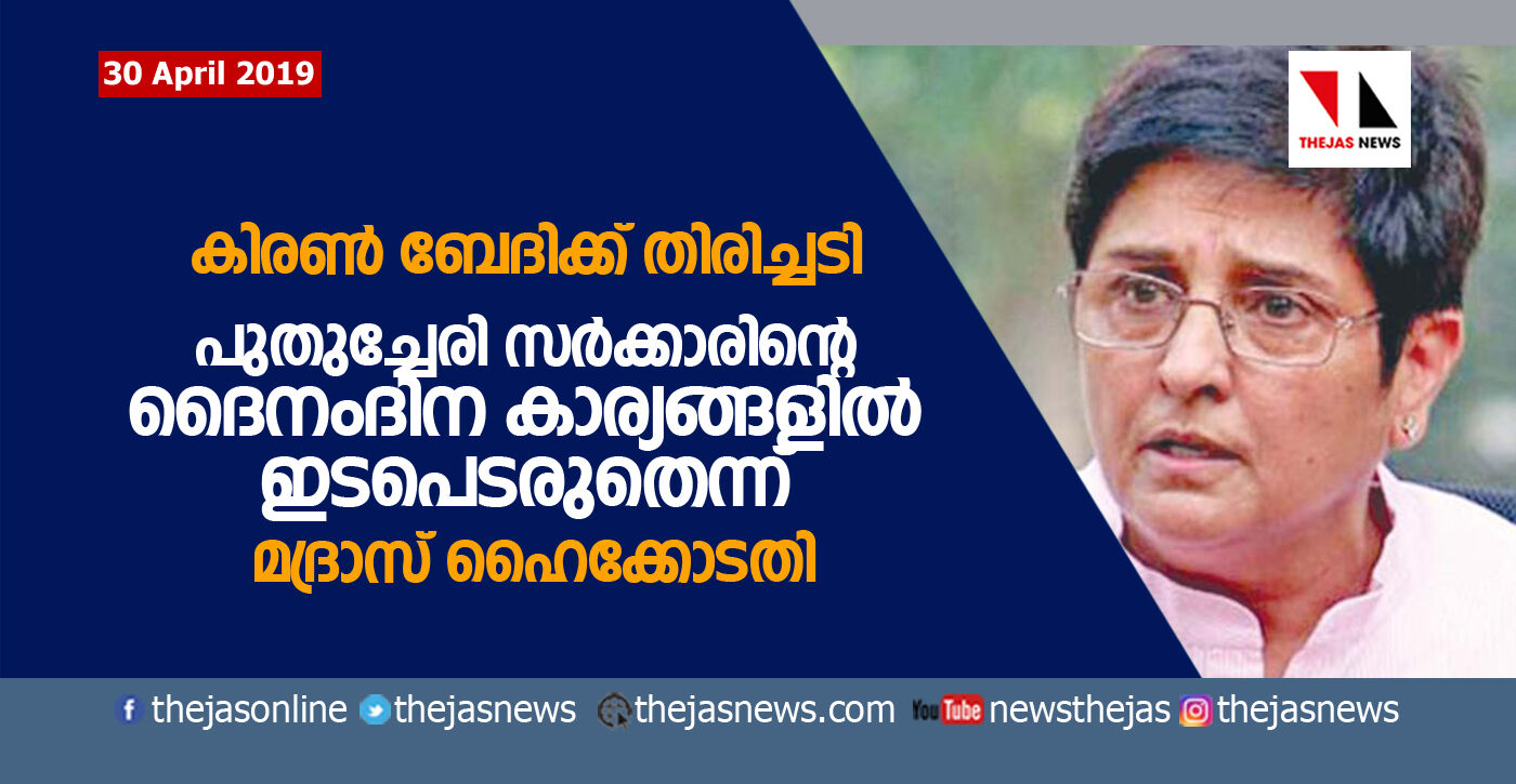 കിരണ് ബേദിക്ക് തിരിച്ചടി; പുതുച്ചേരി സര്ക്കാരിന്റെ ദൈനംദിന കാര്യങ്ങളില് ഇടപെടരുതെന്ന് മദ്രാസ് ഹൈക്കോടതി