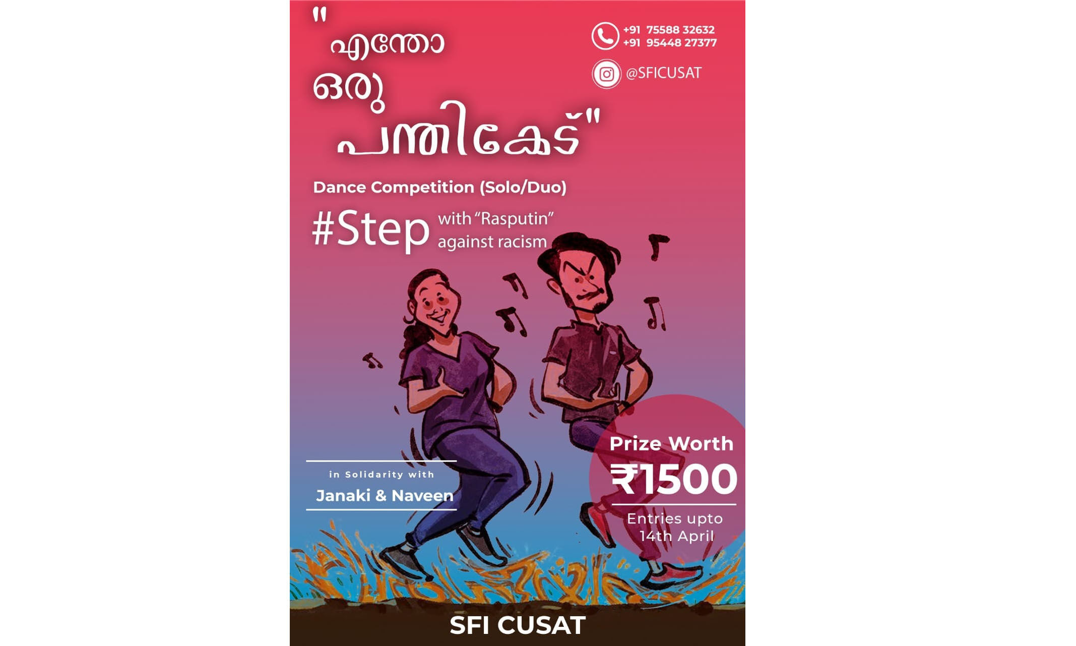 കൂടുതല് വിവരങ്ങള്ക്ക് SFI CUSAT ഇന്സ്റ്റാഗ്രാം സ്റ്റോറി ഹൈലൈറ്റ് ശ്രദ്ധിക്കുക. https://instagram.com/sficusat?igshid=1xhirg5l5vt3y എന്നും അറിയിച്ചിട്ടുണ്ട്. 1500 രൂപയാണ് സമ്മാനം പ്രഖ്യാപിച്ചിട്ടുള്ളത്. നവീനും ജാനകിയും ചെയ്ത 30 മിനുട്ട് ദൈര്ഘ്യമുള്ള നൃത്തം സാമൂഹിക മാധ്യമങ്ങളില് വൈറലായതിനു പിന്നാലെയാണ് സംഘപരിവാരം ഇരുവരുടെയും മതം തിരഞ്ഞ് വിദ്വേഷപ്രചാരണം നടത്തിയത്. എന്തോ ഒരു പന്തികേട് തോന്നുന്നു എന്ന പരാമര്ശത്തോടെയാണ് ജാനകി ഓം കുമാറിന്റെയും നവീന് റസാഖിന്റെയും പൂര്ണമായ പേര് സഹിതം വിദ്വേഷപ്രചാരണം നടത്തിയത്. ഇതിനെതിരേ സാമൂഹിക മാധ്യമങ്ങളില് വന്തോതില് വിമര്ശനം ഉയരുകയും എന്സിഎച്ച്ആര്ഒ, അതിജീവന കലാസംഘം എന്നിവ പോലിസില് പരാതി നല്കുകയും ചെയ്തിരുന്നു. അതിനിടെ, സ്വകാര്യ എഫ്എമ്മിന്റെ പരിപാടിയില് ഇരുവരും വീണ്ടും നൃത്തം ചെയ്ത് വിദ്വേഷപ്രചാരകര്ക്ക് കനത്ത മറുപടി നല്കിയിരുന്നു.
