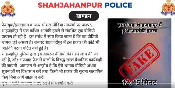 यूपी के जिला शाहजहांपुर में आतंकी हमला होने की फर्जी सूचना फैलाई गई। सपा सांसद आदित्य यादव नाम से FB आईडी बनाकर गोलियों की आवाज वाली फर्जी Video डाली गई। पुलिस ने FB यूजर परविंदर और इंस्टाग्राम यूजर अंकित कुमार पर FIR दर्ज की। pic.twitter.com/QP8z1ooYXq