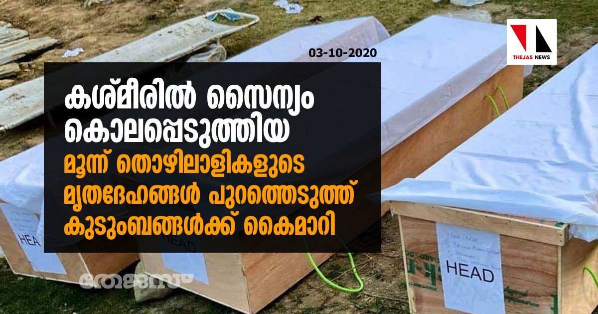 കശ്മീരിൽ സൈന്യം കൊലപ്പെടുത്തിയ മൂന്ന് തൊഴിലാളികളുടെ മൃതദേഹങ്ങൾ പുറത്തെടുത്ത് കുടുംബങ്ങൾക്ക് കൈമാറി