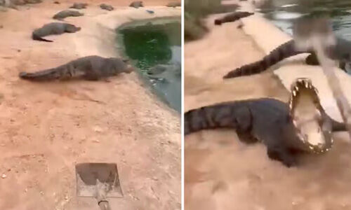 മണ്കോരിയുമായി മുതലകളെ കുളത്തിലേക്ക് ഓടിക്കുന്ന ദൃശ്യങ്ങള് വൈറലാവുന്നു