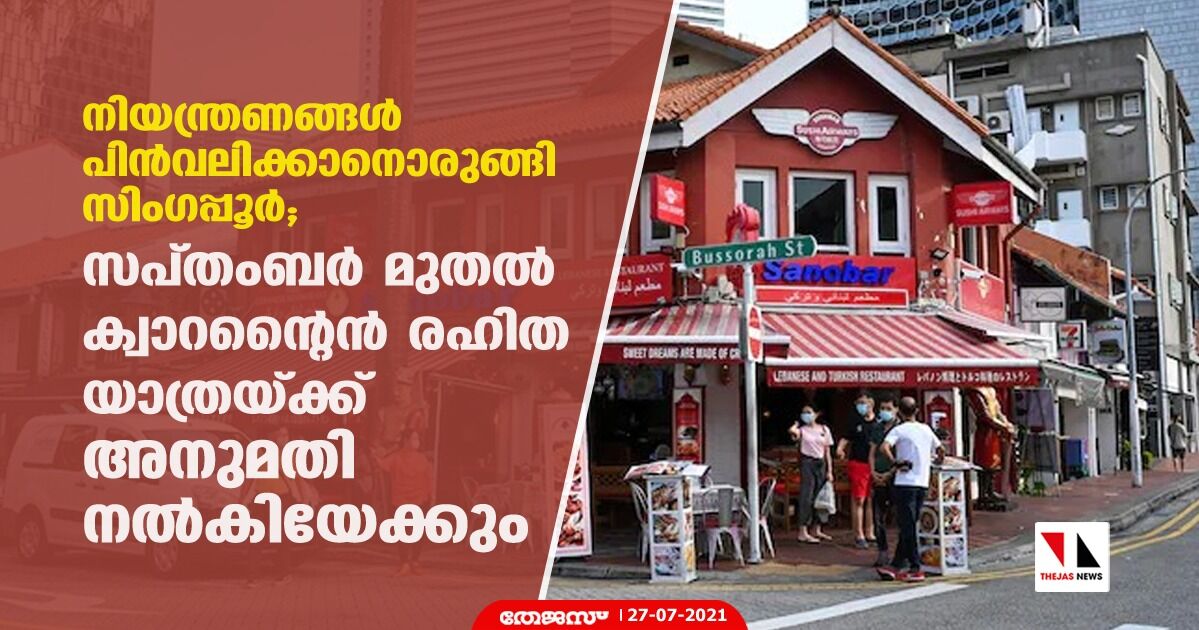 നിയന്ത്രണങ്ങള് പിന്വലിക്കാനൊരുങ്ങി സിംഗപ്പൂര്; സപ്തംബര് മുതല് ക്വാറന്റൈന് രഹിത യാത്രയ്ക്ക് അനുമതി നല്കിയേക്കും
