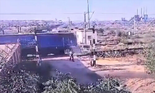 📍Rajasthan | #Watch: An SUV of a central police force was rammed by a train at a level crossing near Suratgarh Super Thermal Power Plant in Rajasthan.