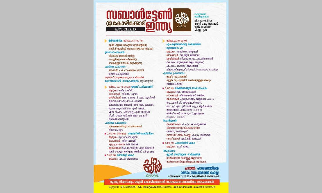 കോഴിക്കോട്: ചായലിന്റെ നേതൃത്വത്തില് നടത്തുന്ന രണ്ടാമത് സബാള്ട്ടേണ് ഇന്ത്യ കോഴിക്കോടന് നാടകോല്സവം നാളെ സമാപിക്കും. ടൗണ്ഹാളിലും ആനക്കുളം സാംസ്കാരിക വേദിയിലുമായി നടക്കുന്ന നാടകോല്സവത്തില് ആറു നാടകങ്ങളാണ് അരങ്ങേറുന്നത്. ഡിഎച്ച്ആര്എമ്മിന്റെ നേതൃത്വത്തില് ബുദ്ധമത പുരോഹിതന് വന്ദേജി ധമ്മമിത്രയുടെ ആരാധനയോടെയാണ് പരിപാടിക്ക് തുടക്കമായത്. മരണപ്പെട്ട കലാകാരന്മാരുടെ ഫോട്ടോ പ്രദര്ശനവും നടന്നു. വെള്ളിയാഴ്ച യൂത്ത് പാര്ലമെന്റ്, പുസ്തക പ്രകാശനം ദണ്ഡനീതി ഫെമിനിസം, ആര്ട്ട് ഗാലറിയില് 'മണിപ്പൂര് കഫേ' എന്നിവ നടന്നു. എ പി കുഞ്ഞാമു ആമുഖം നടത്തി. നാളെ രാവിലെ 10ന് എം കുഞ്ഞാമന്റെ ഓര്മയില് മുത്തങ്ങ @ 20 എന്നിവ നടക്കും. കാളി കെ അട്ടപ്പാടി ആമുഖം നടത്തും. സി ആര് ബിജോയ് മോഡറേറ്ററാവും. സി കെ ജാനു, എം ഗീതാനന്ദന്, കെ കെ സുരേന്ദ്രന്, ആര് സുഭാഷ്, എം കെ രാംദാസ്, ആര് നഞ്ചി, ലിംഗരാജ് ആസാദ് പങ്കെടുക്കും. ഖദീജാ മുംതാസിന്റെ മുസ് ലിം സുഹൃത്തിന്, മുസ് ലിം സുഹൃത്തില് താല്പര്യമുള്ളവര്ക്കും എന്ന പുസ്തകം പ്രകാശനം ചെയ്യും. ഉച്ചയ്ക്ക് രണ്ടിനു നടക്കുന്ന ദക്ഷിണേന്ത്യന് ഭാഷാ സംഗമത്തില് വിജയരാഘവന് ചേലിയ മോഡറേറ്ററാവും. കെ അബുബക്കര്, പുരുഷോത്തം ബിളിമലെ, ഡോ. എസ് പി ഉദയകുമാര്, ഡോ. എ എം ശ്രീധരന്, ആര് രംഗന്, മൃദുലാദേവി എസ്, മണിക്ഫാന്, ഡോ. എസ് എം മുല്ലക്കോയ പങ്കെടുക്കും. ഡെത്ത് കഫേ(പി എം ബാലകൃഷ്ണന്), തിബത്തന് സാംസ്കാരിക യാത്ര(ബൈജു മേരിക്കുന്ന്), നൊമാഡ് ഫിലിം ഫെസ്റ്റ്(പികെ ഗണേഷന്), റൈറ്റ് ഷോപ്പ്(എന്ബി ജയലാല്) എന്നിവരുടെ റിപോര്ട്ടുകള്. വൈകീട്ട് ആറിന് നടക്കുന്ന ഫലസ്തീന് കഫേയില് ടോമി മാത്യു ആമുഖം നടത്തും. സ്റ്റാന്സാമിയുടെ ഓര്മയില് ജാര്ഖണ്ഡില്നിന്നുള്ള ആദിവാസി സര്ണേ മതവിശ്വാസികളും ആരാധനയോടെ പരിപാടി സമാപിക്കും.