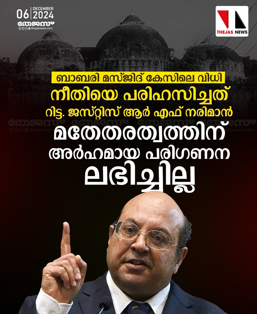 'ബാബരി മസ്ജിദ് കേസിലെ വിധി നീതിയെ പരിഹസിച്ചത്, മതേതരത്വത്തിന് അര്ഹമായ പരിഗണന ലഭിച്ചില്ല'- റിട്ട. ജസ്റ്റിസ് ആര് എഫ് നരിമാന്